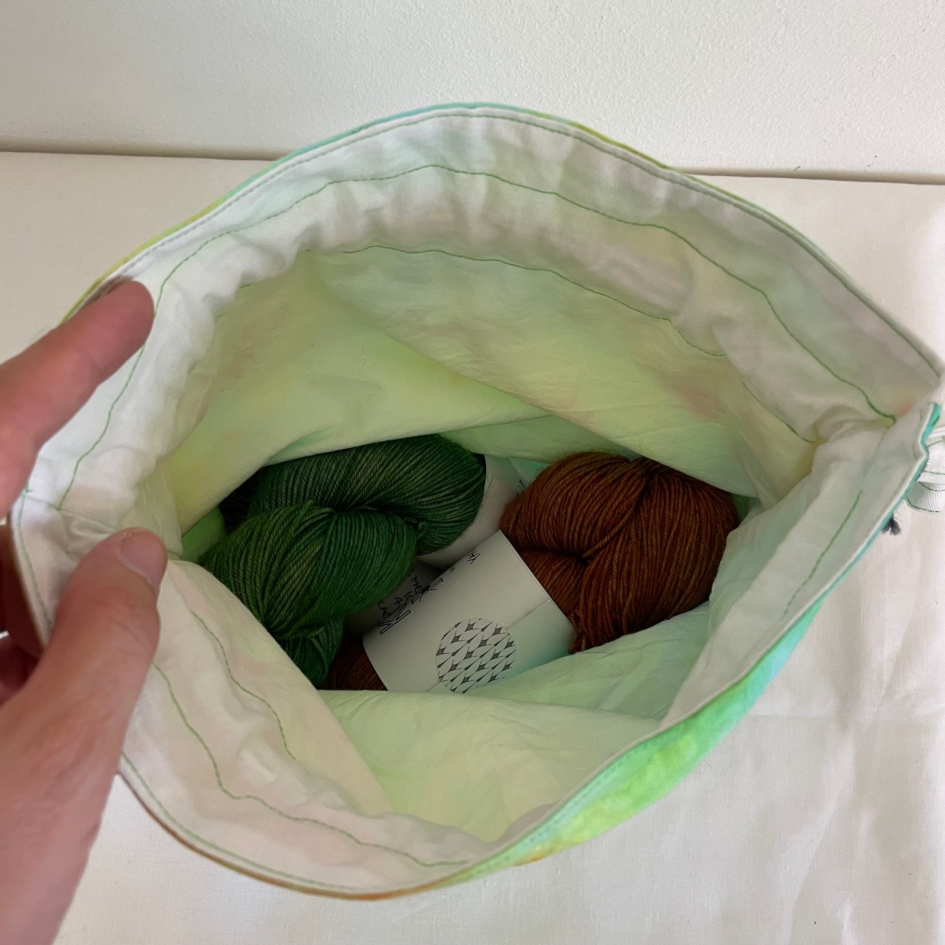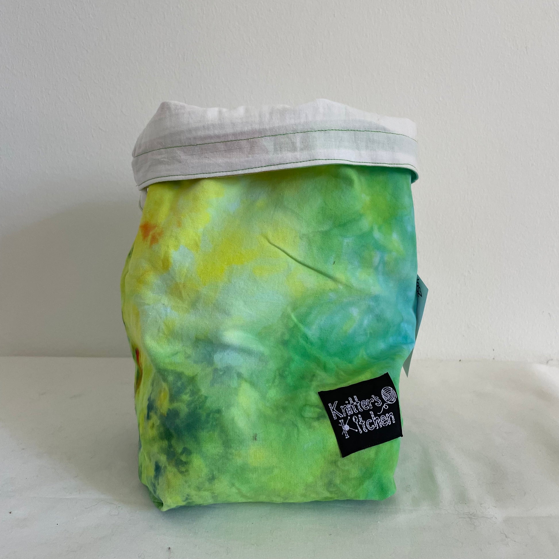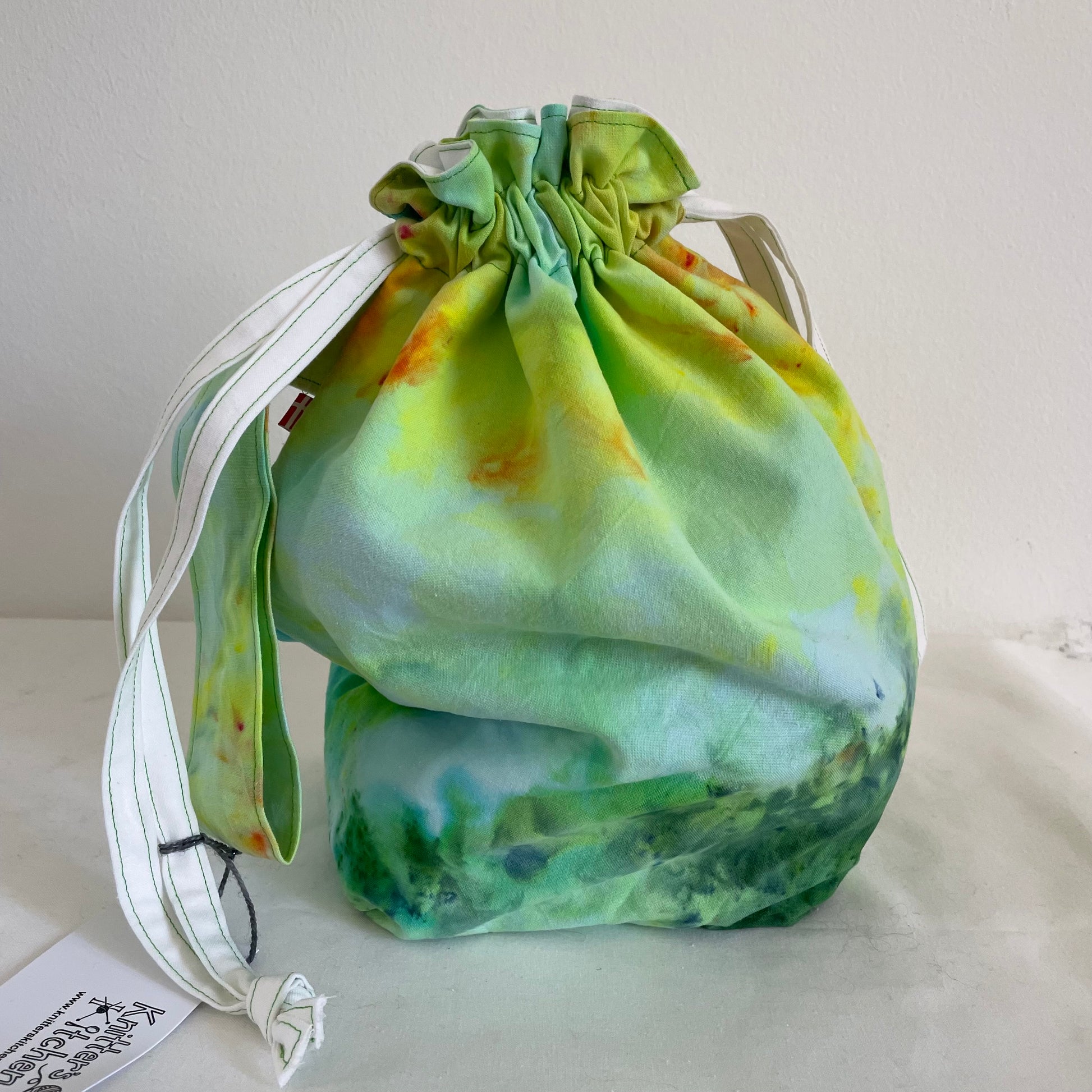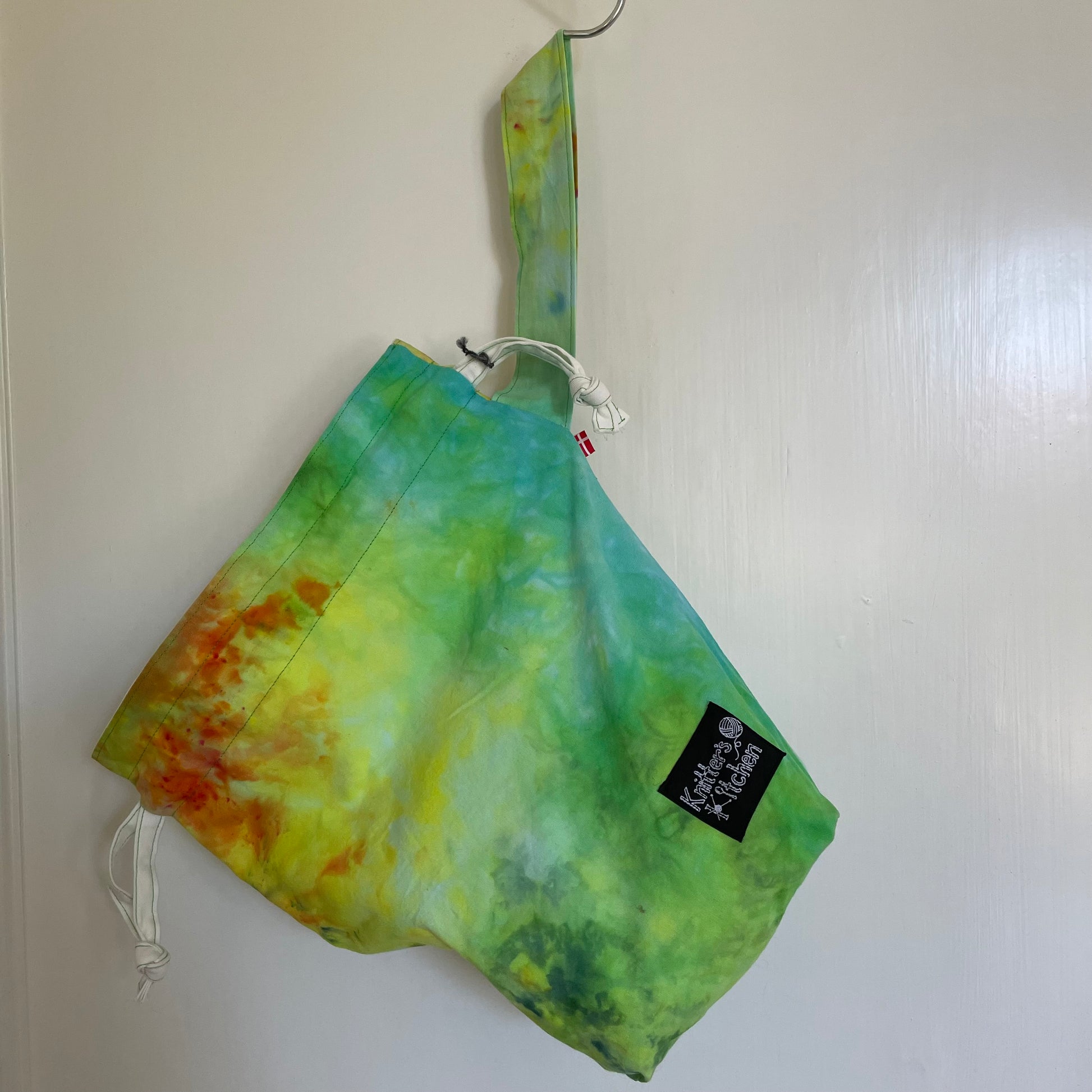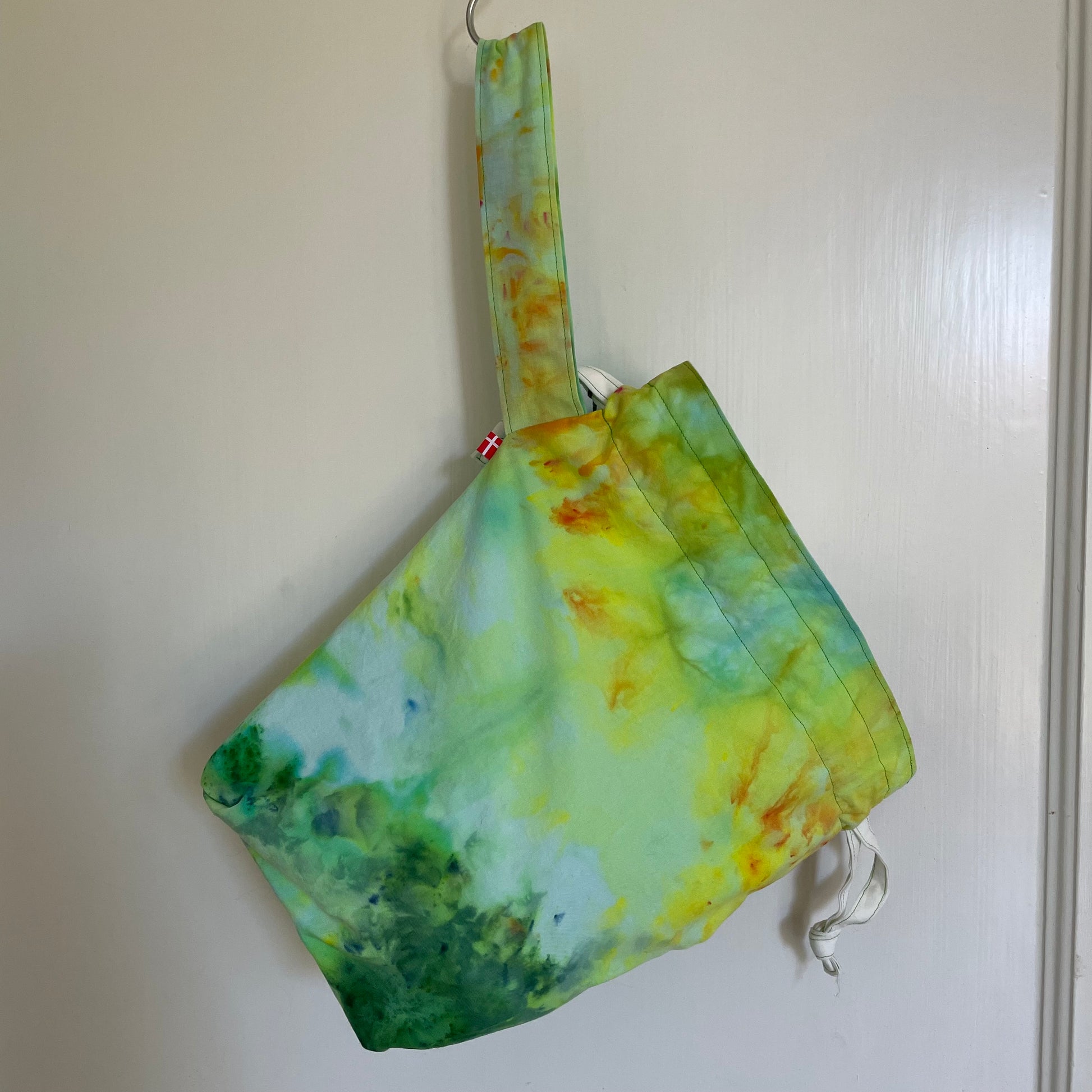 En foret pose med håndtag og lukkesnore. Yderstoffet er farvet med is-farvningsmetoden, hvor stoffet dækkes med is og drysses med farvepulver, hvorefter farven langsomt trækker ned i stoffet efterhånden som isen smelter. Resultatet er fuldstændig uforudsigeligt, hvorved hver pose er unik.