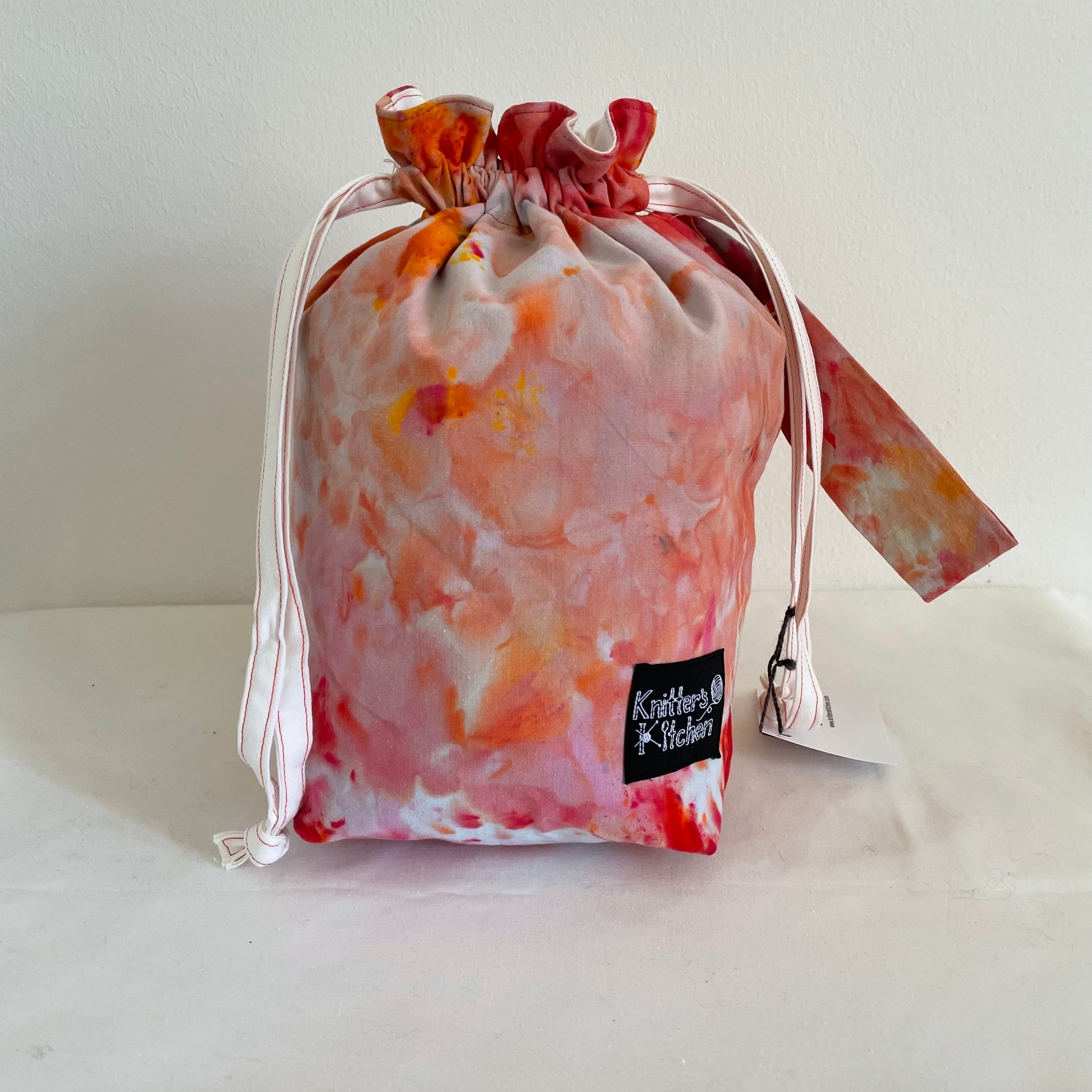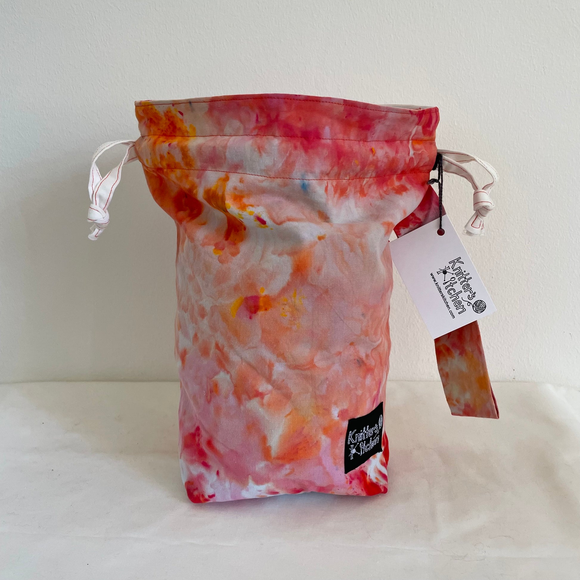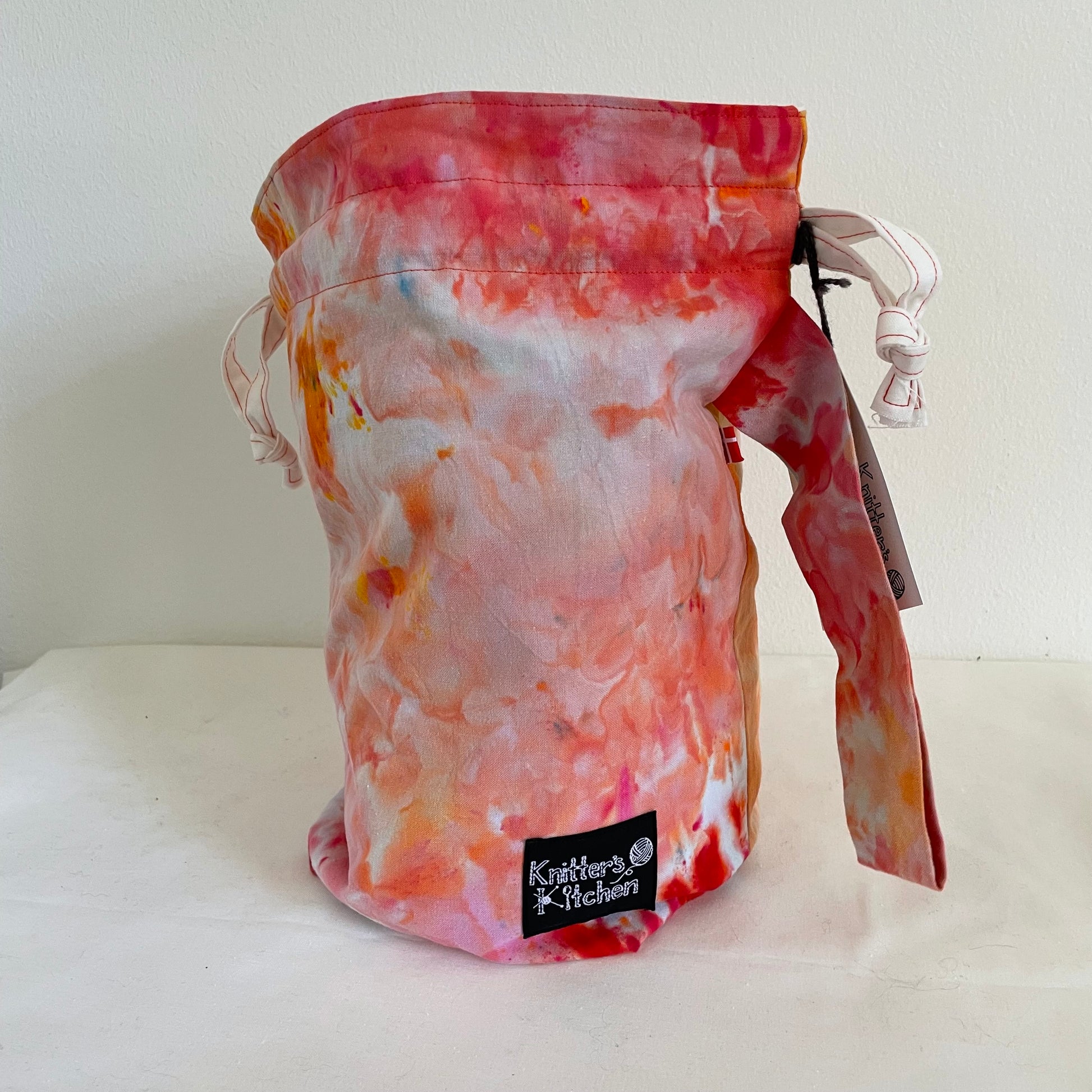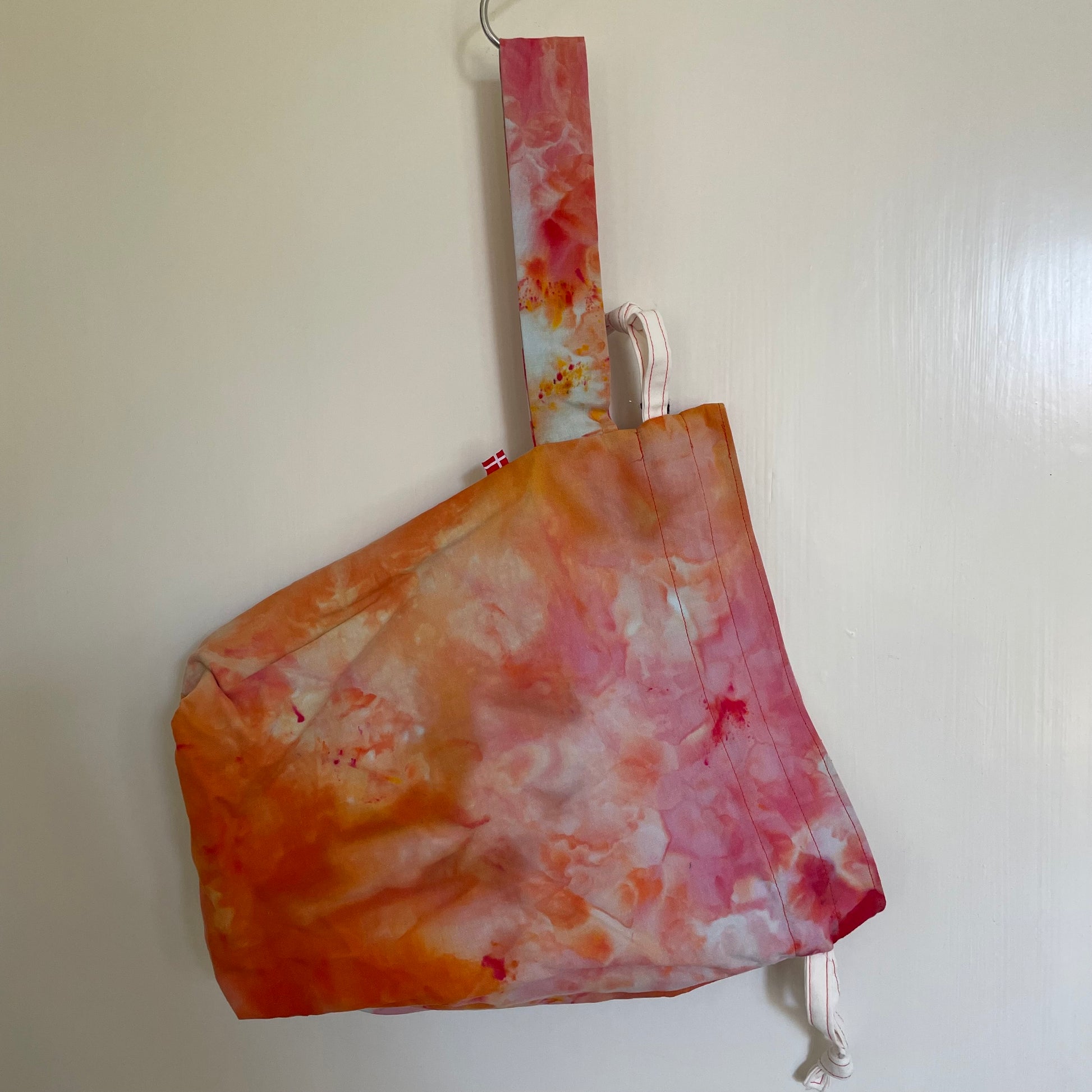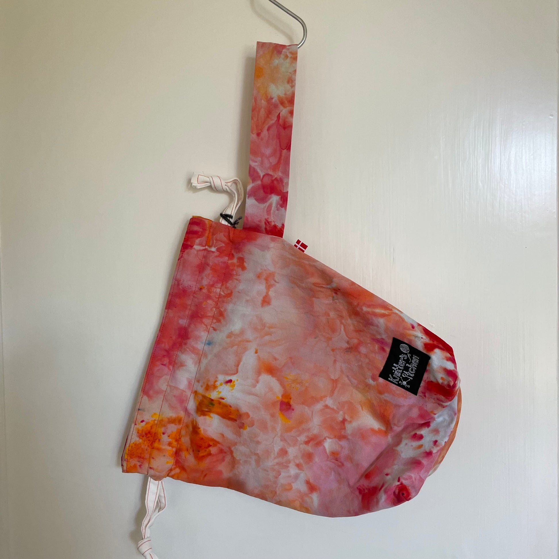 En foret pose med håndtag og lukkesnore. Yderstoffet er farvet med is-farvningsmetoden, hvor stoffet dækkes med is og drysses med farvepulver, hvorefter farven langsomt trækker ned i stoffet efterhånden som isen smelter. Resultatet er fuldstændig uforudsigeligt, hvorved hver pose er unik.