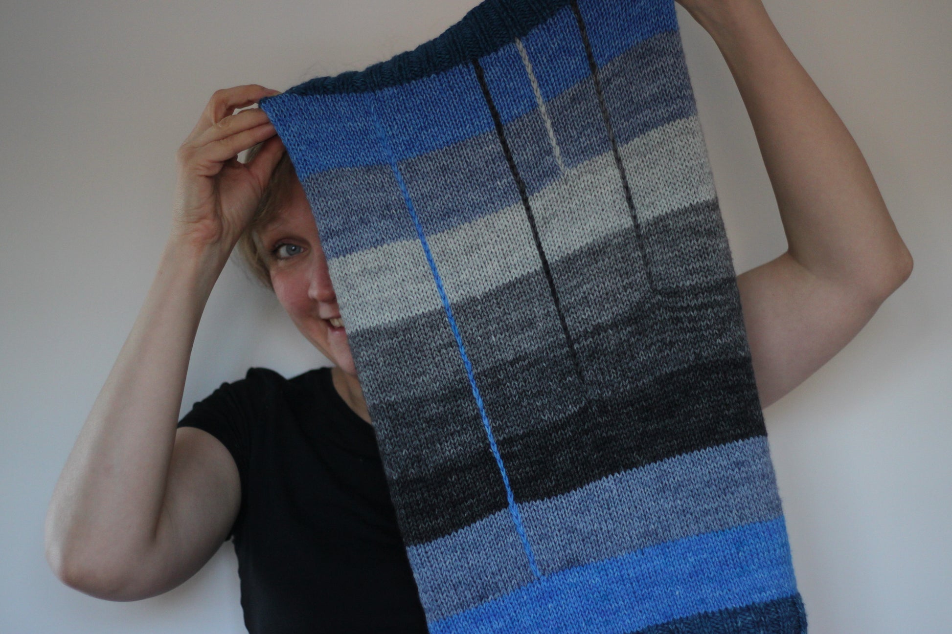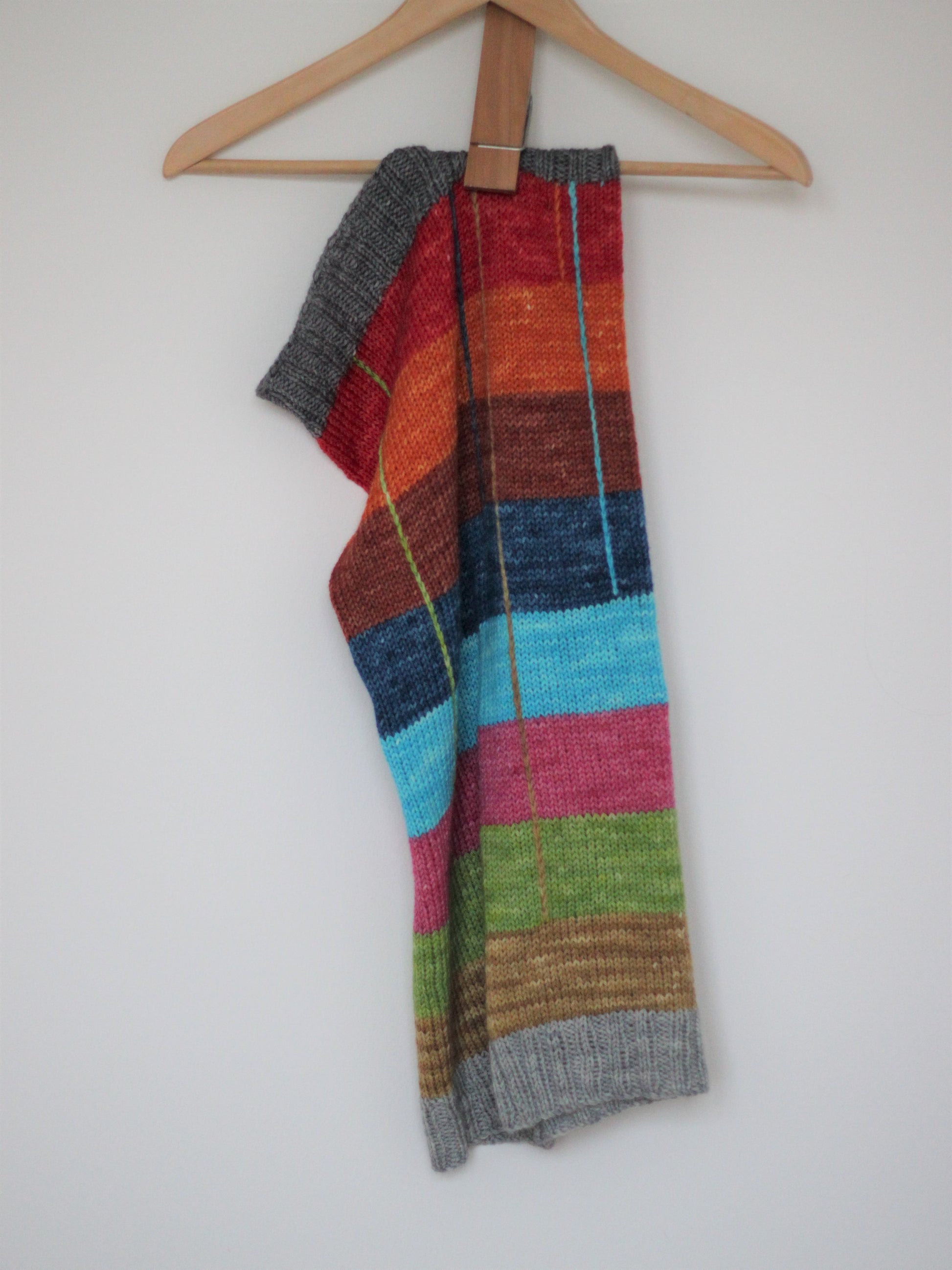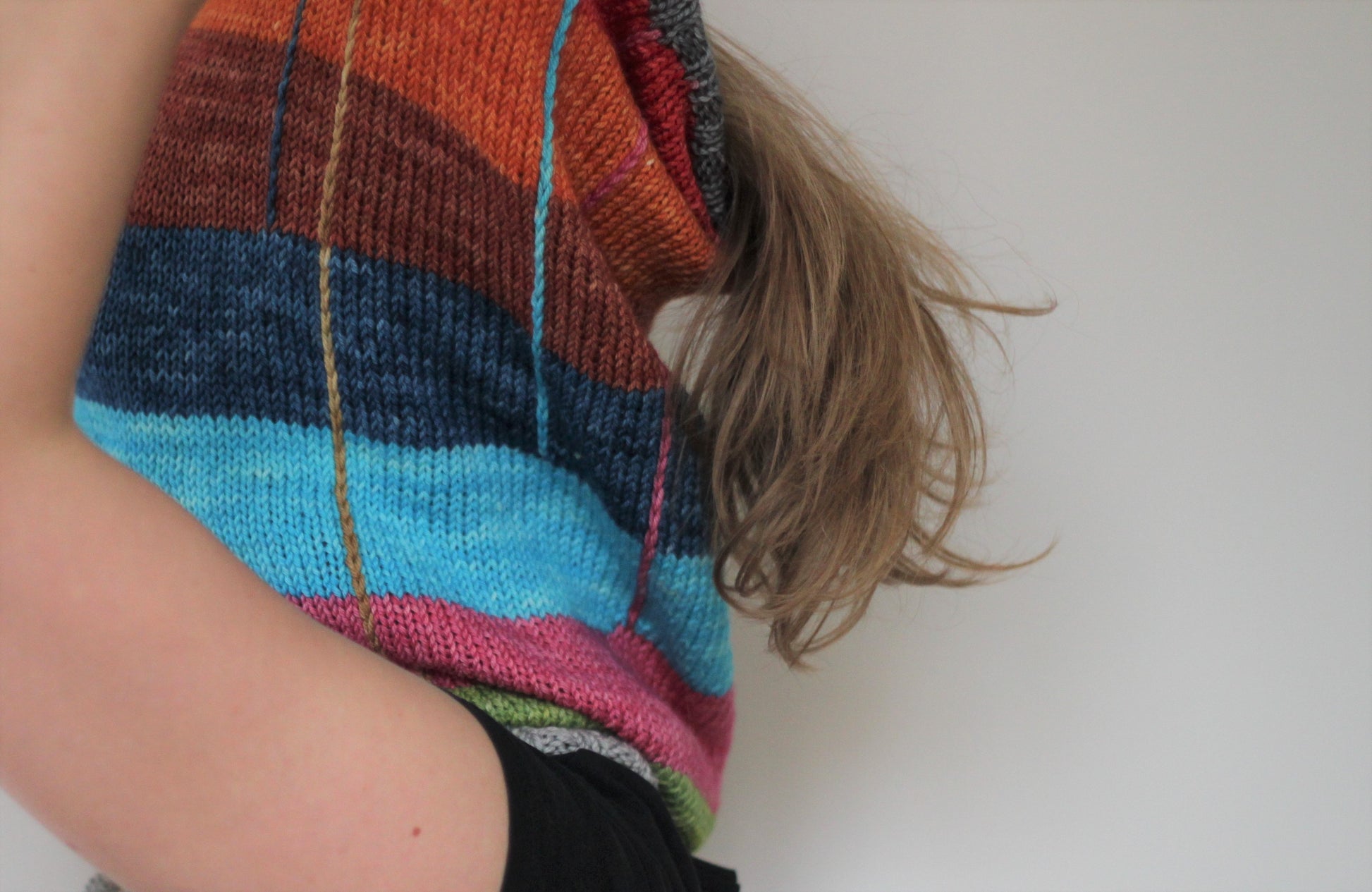 Jeg kom alle mine små garnnøgler i en stor pose, og trak en tilfældig farve op hver gang det var tid til et farveskift. Nervepirrende, spændende og sjovt! Man kan naturligvis også planlægge sin farverækkefølge nøje hvis man hellere vil det.