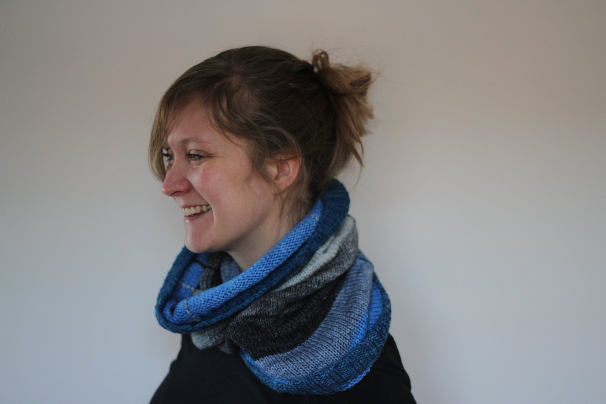Randomize Cowl er et simpelt halsrør strikket rundt i glatstrik, med lodrette striber der hækles på efterfølgende.