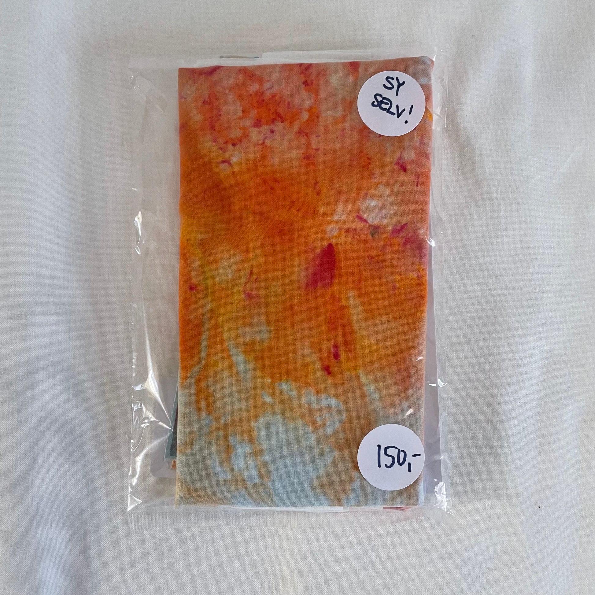 - Yderstof: 2 stykker håndfarvet stof, ca. 30 cm x 40 cm. Markeringer i siderne i toppen af stykkerne angiver løbegang til lukkesnor.